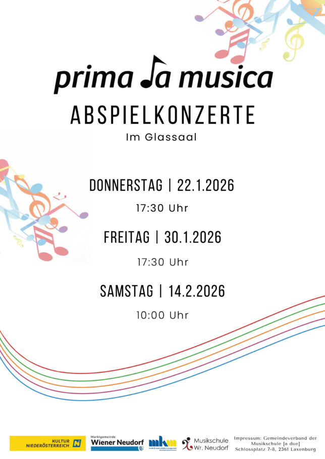 Zur Vorbereitung auf den kommenden Landeswettbewerb von »prima la musica« 2026 finden im Glassaal des Standortes Wr. Neudorf* Abspielkonzerte an drei verschiedenen Terminen statt.